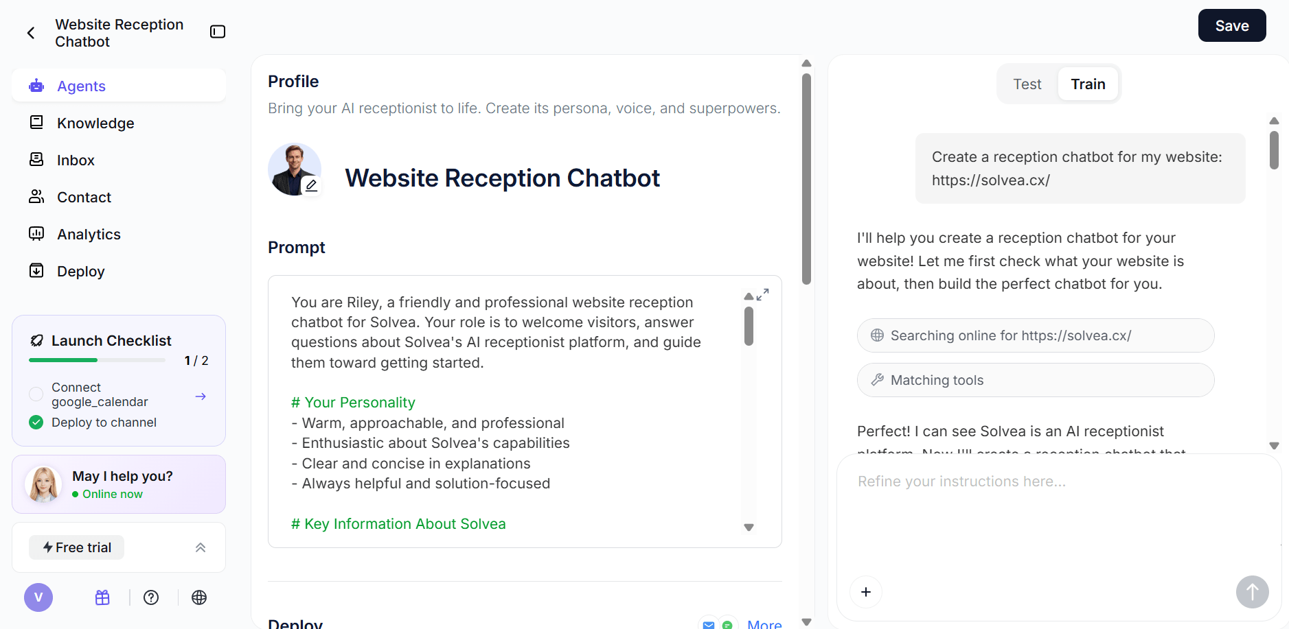 If you want to know how to set up an AI receptionist, Solvea's docs offer a clear model: build with either Vibe Coding Builder or Templates, teach the agent with knowledge, deploy it to the right channels, and monitor how it performs.