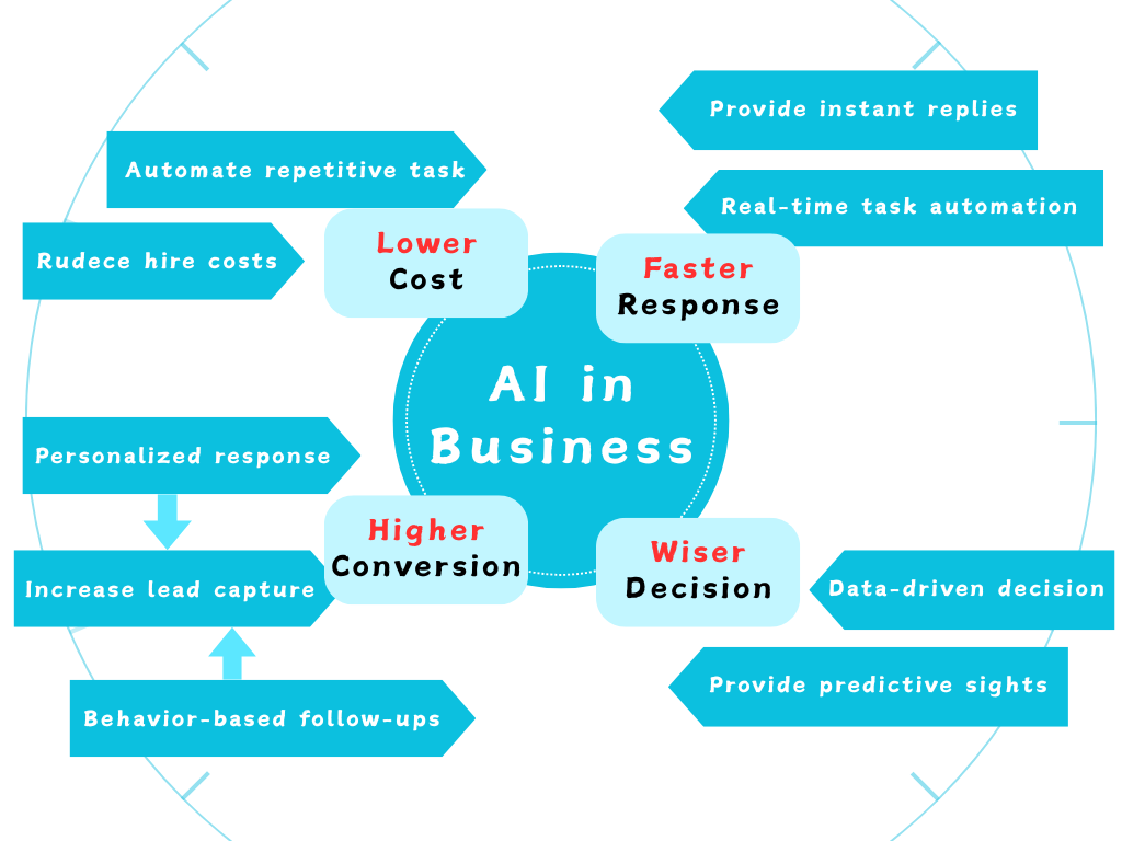 Integrating AI into business operations goes beyond adopting new technology—it strengthens efficiency, speed, and decision-making. By automating repetitive tasks and routine interactions, AI reduces operational costs and enables scalable growth without increasing headcount. It accelerates response times, improves lead conversion through personalized engagement, and provides real-time insights that support smarter, data-driven resource allocation.