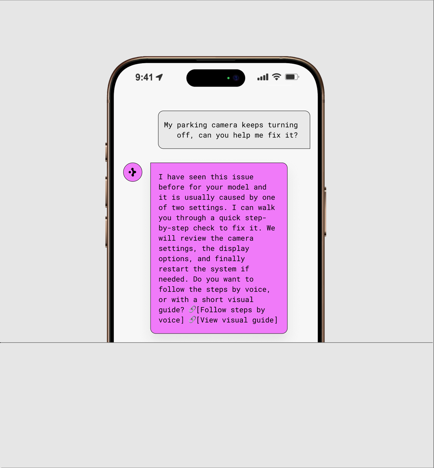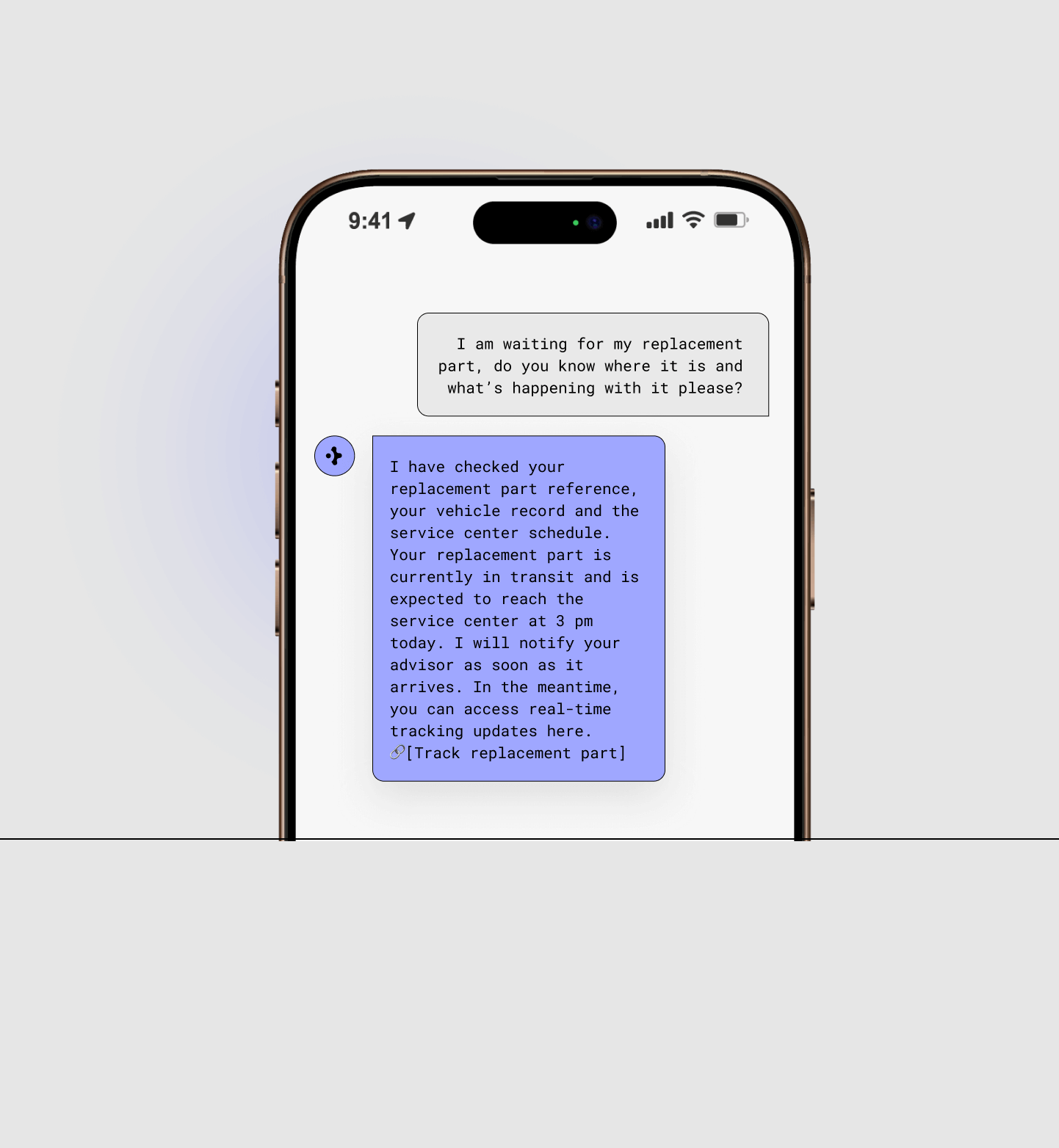 Solvea interprets the full context behind each query, identifying vehicle details, part references, issue types, and system status in real time.