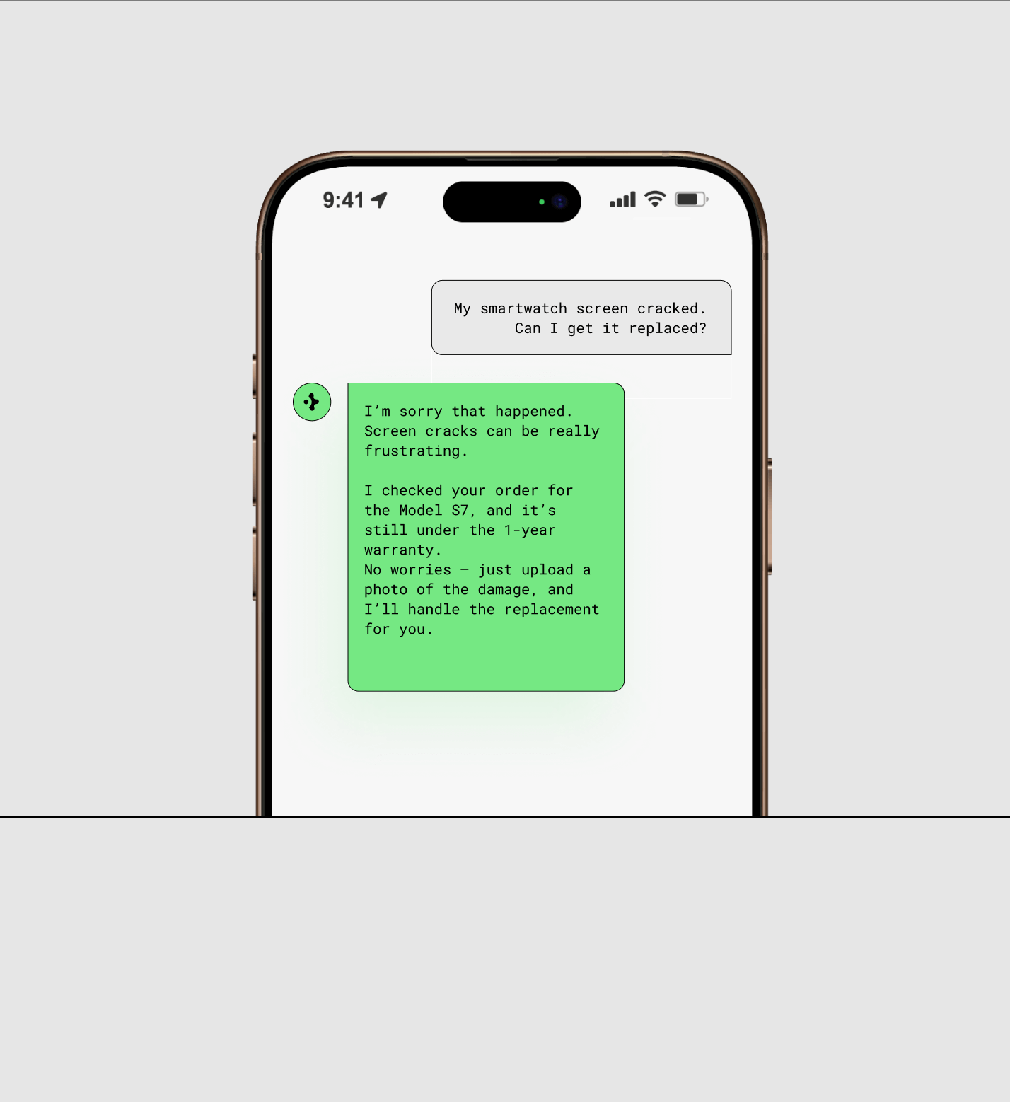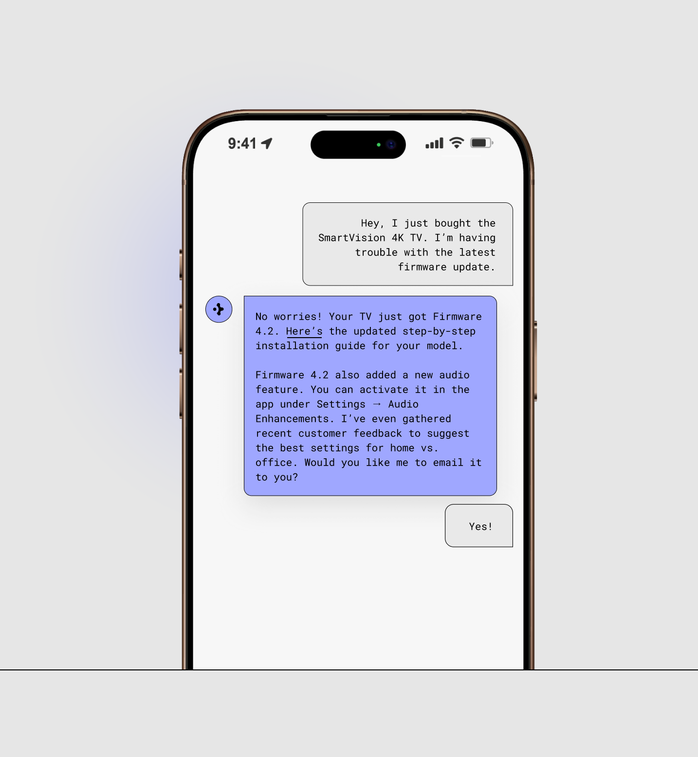 Solvea’s AI support automation goes far beyond traditional chatbots. It instantly recognizes model numbers, issue types, and multi-channel context to diagnose technical problems and guide customers step-by-step with clear, user-friendly instructions — delivered through text, video, or file attachments.